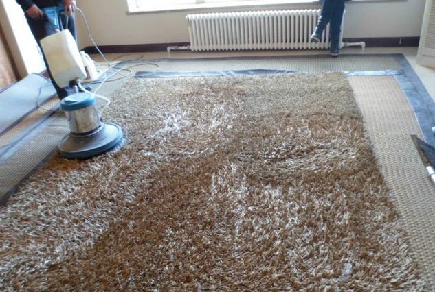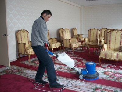 清洗方法 1、所需工具:多功能清洗机、洗尘吸水机、烘干机。 2、所需药剂:高泡地毯清洁剂或低泡地毯清洁剂、地毯去渍剂。 3、清理现场:将室内可移动的小件物品(如椅子、纸篓、花盆等)清理出去,让出最大的空间以便清洗。 4、局部处理:对于特殊的污渍如:墨水印、茶叶水、咖啡渍等,如果用一般清洗方法很难去除,局部处理时先将药水原液滴入特殊部位,浸泡3-5分钟后,再用板刷轻轻一刷即可去除顽渍,一般可大面积洗。 5、清洗开始:选择好合适的刷盘装上,将药水按一定的比例配好加入水箱内,然后开机清洗。 6、吸水:用大功率吸水机快速吸干。 7、吹干:此步可根据要求,如没有特殊要求此步可省去不做。 保洁标准 地毯各部位色调一致,无积水。无污渍。无异味。鲜明柔顺。 施工现场及效果图: